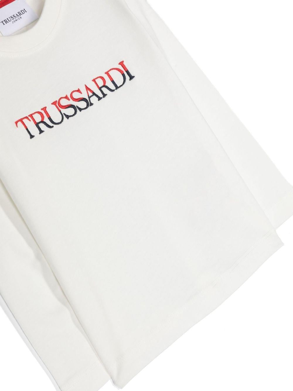 T-shirt bianca in jersey di cotone per neonato con logo ricamato sul davanti della collezione Trussardi Kids.