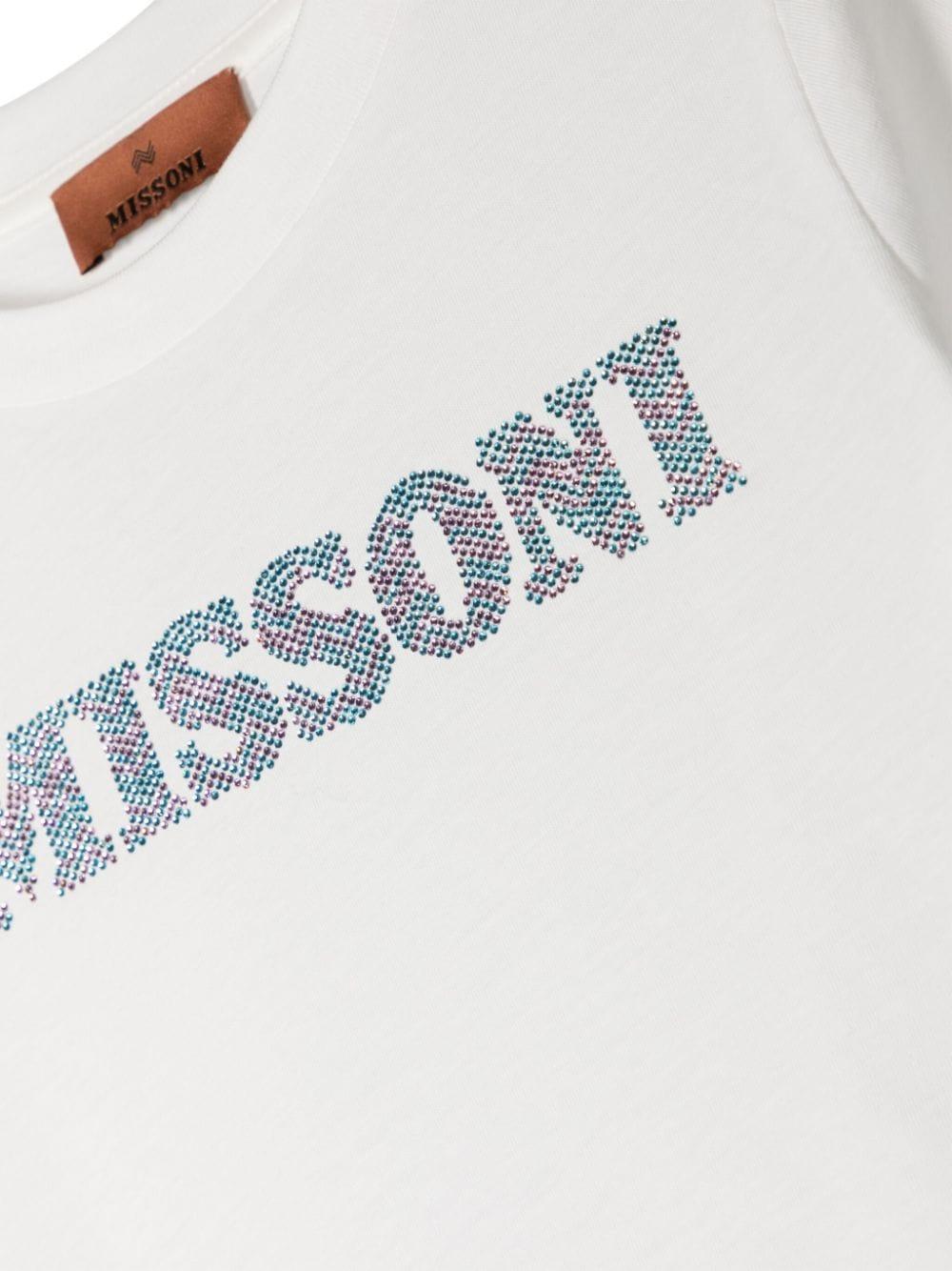 T-shirt bianca in jersey leggero di cotone per bambina con logo blu e rosa in strass sul davanti della collezione Missoni Kids.
