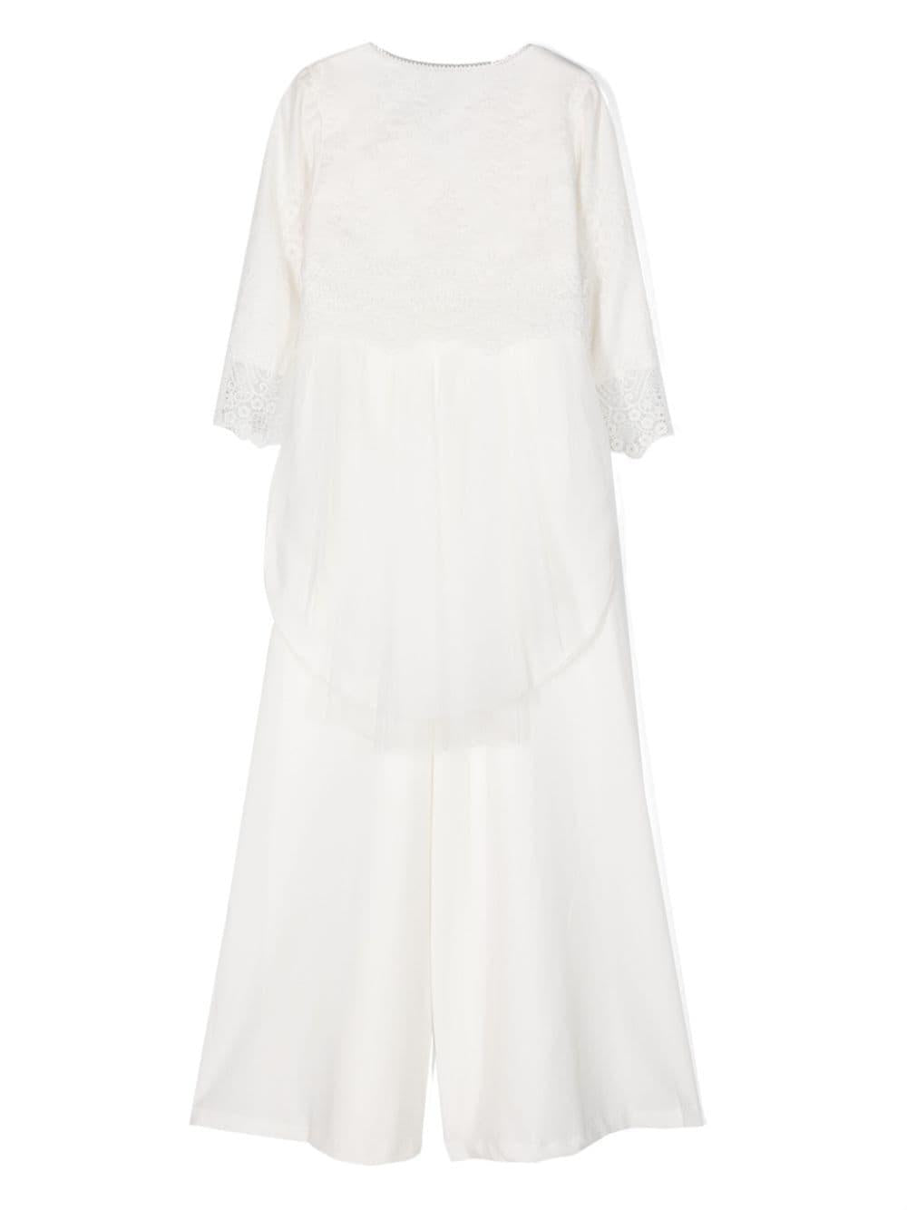 Tuta e cardigan bianco in crepe per bambina di Abel & Lula.