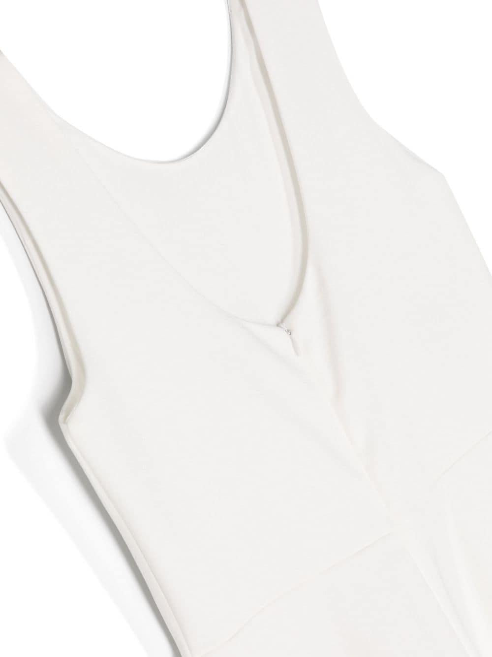 - Tuta: scollo rotondo, scollatura sul retro, chiusura con zip posteriore, senza maniche, vita alta, gamba larga, orlo dritto.