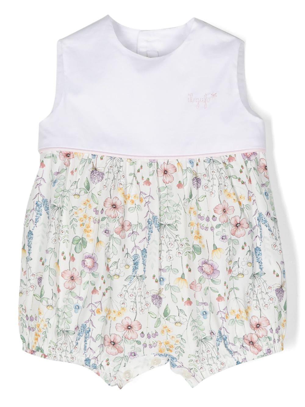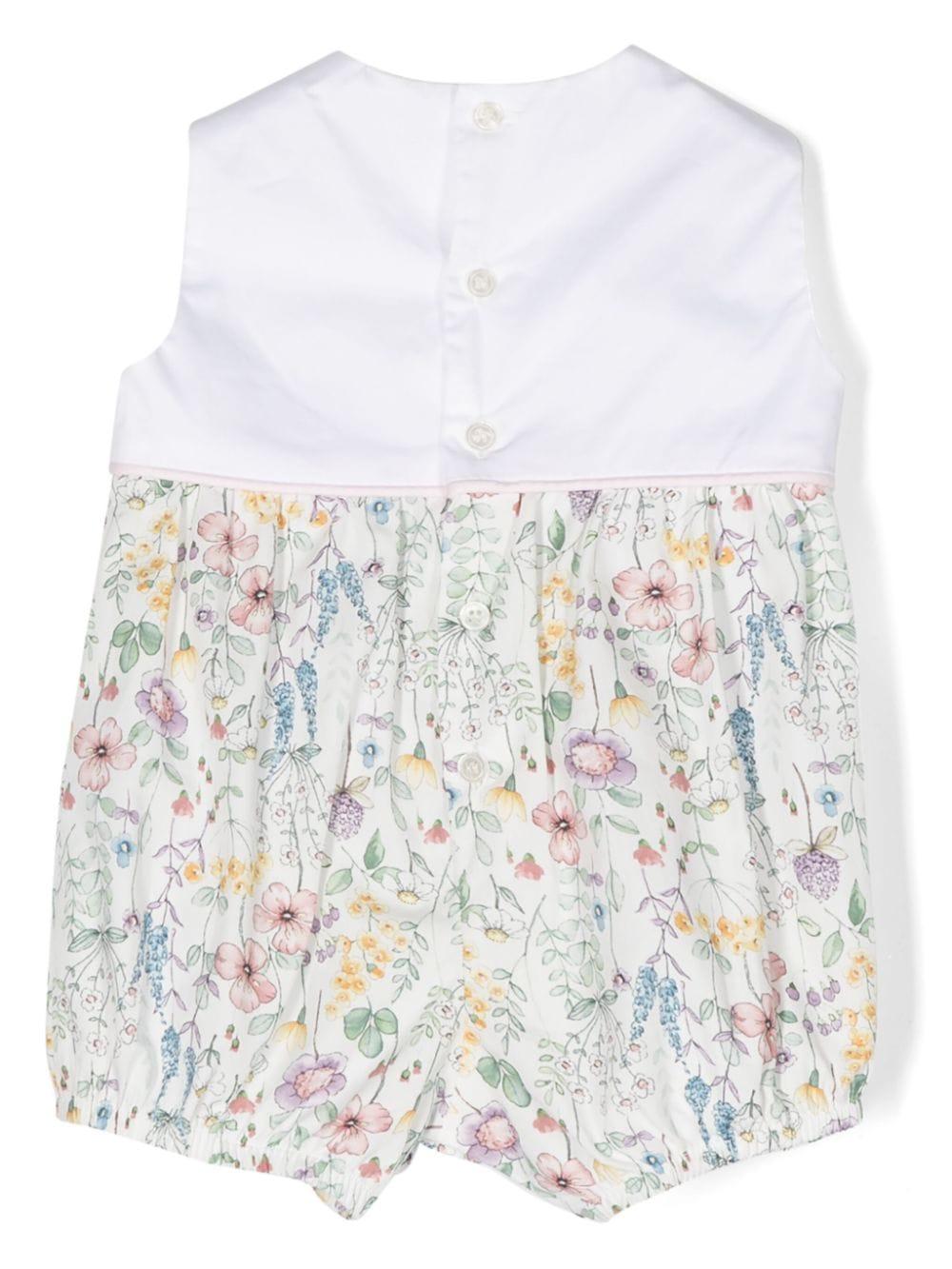 Pagliaccetto bianco in cotone stretch per neonata con stampa floreale multicolore della collezione Il Gufo Kids.