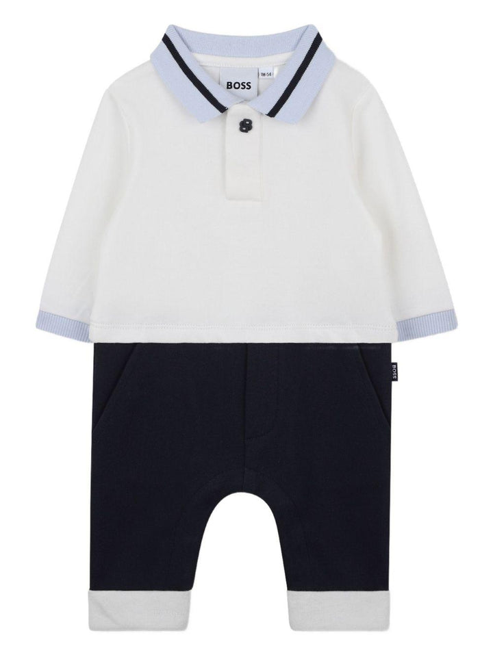 Pagliaccetto da cerimonia in interlock 100% cotone organico bianco/blu per neonato di Boss Kids.