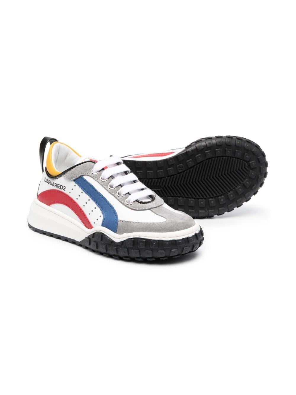 Sneakers bianche in pelle di vitello per bambino a blocchi di colore blu, giallo e rosso di DSQUARED2 KIDS.