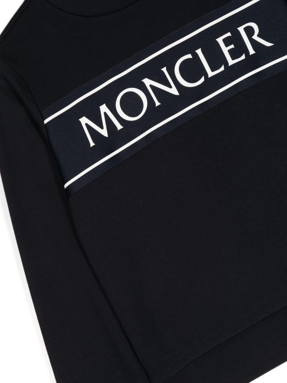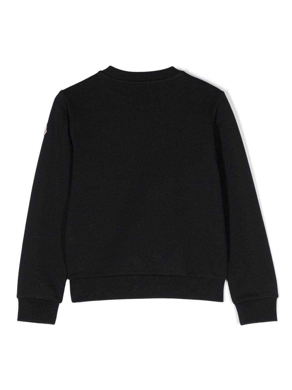 Navy blue cotton sweatshirt for boys with white logo print on the front by Moncler Enfant.