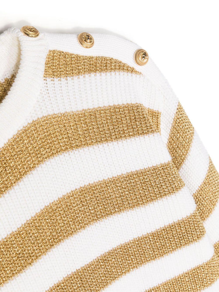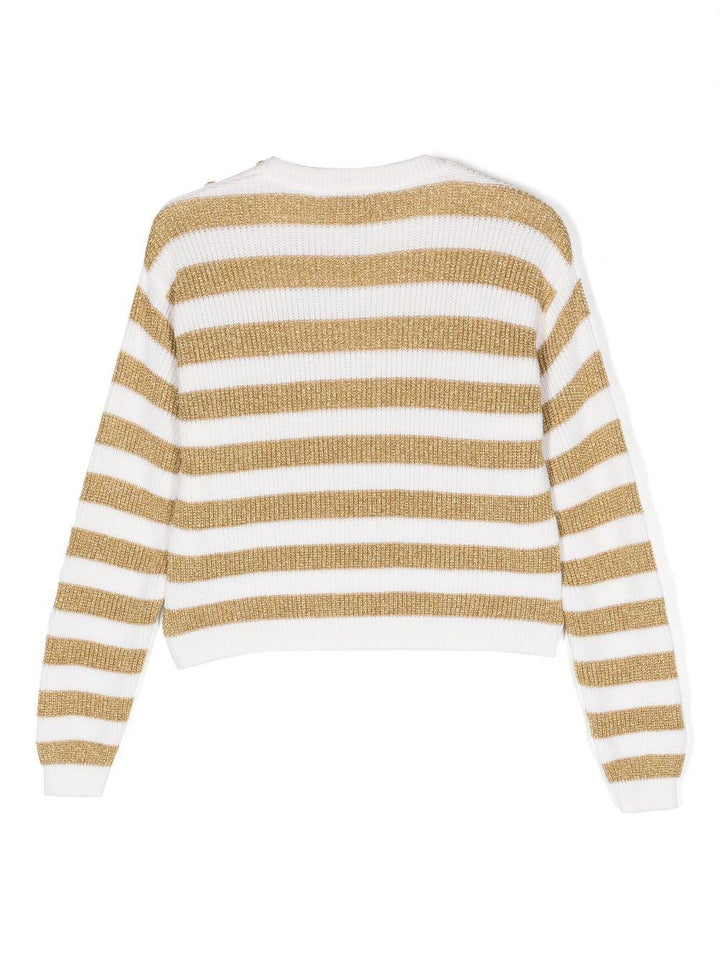 White and gold sweater for girls with horizontal striped pattern by Balmain Kid in wool blend.