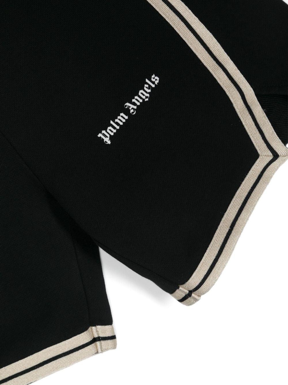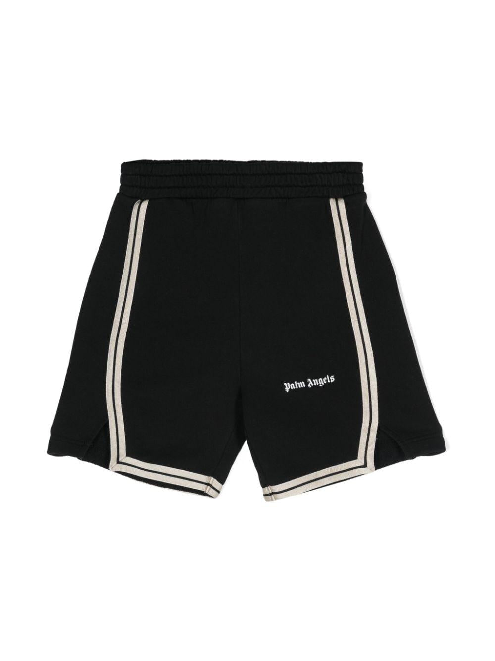 Black cotton Bermuda shorts for boys with white logo print on the front from the Palm Angels Kids collection.