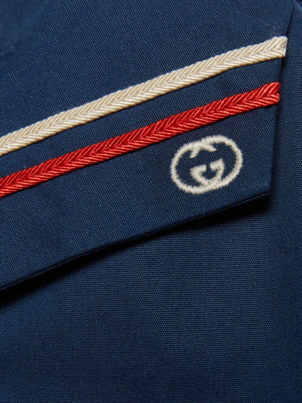 White and navy blue stretch cotton poplin romper for newborns with color block panel design by Gucci Kids.