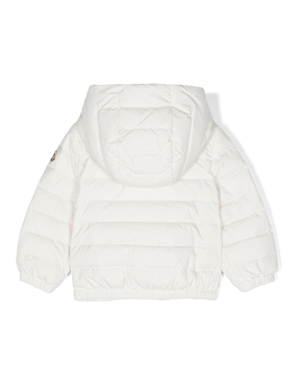 White Atsu jacket with duck down padded design for newborns with applied logo from the Moncler Enfant collection.