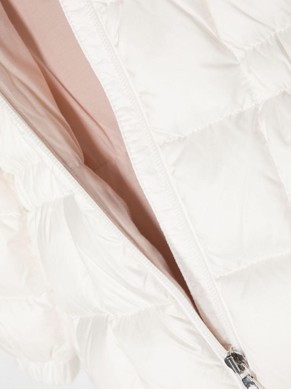 Cappotto imbottito Anya bianco crema con toppa con logo sulla manica per neonata di Moncler Enfant in nylon riciclato e cottone.