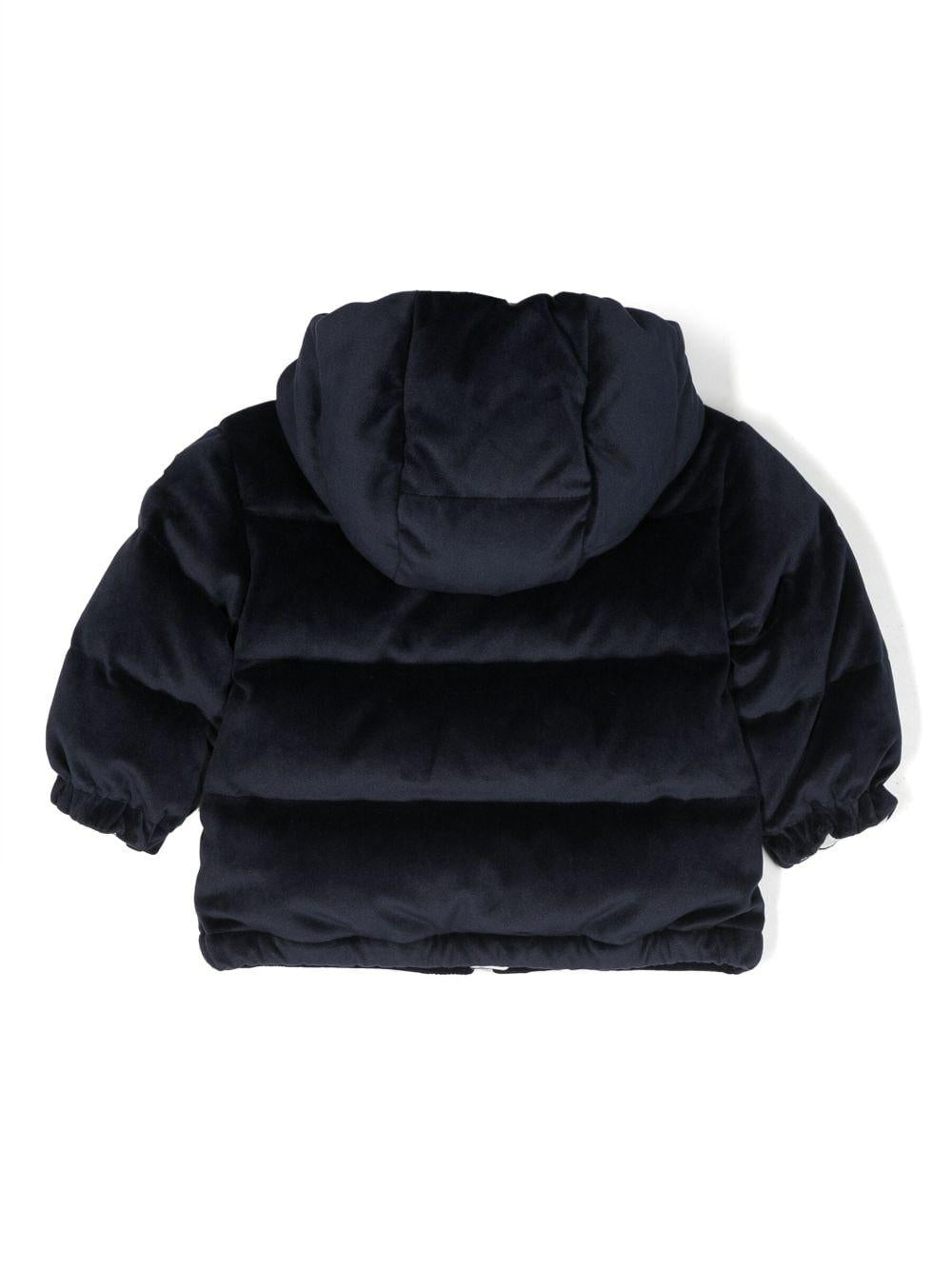 Navy blue Daos padded jacket with hood for baby girls by Moncler Enfant in velvet.