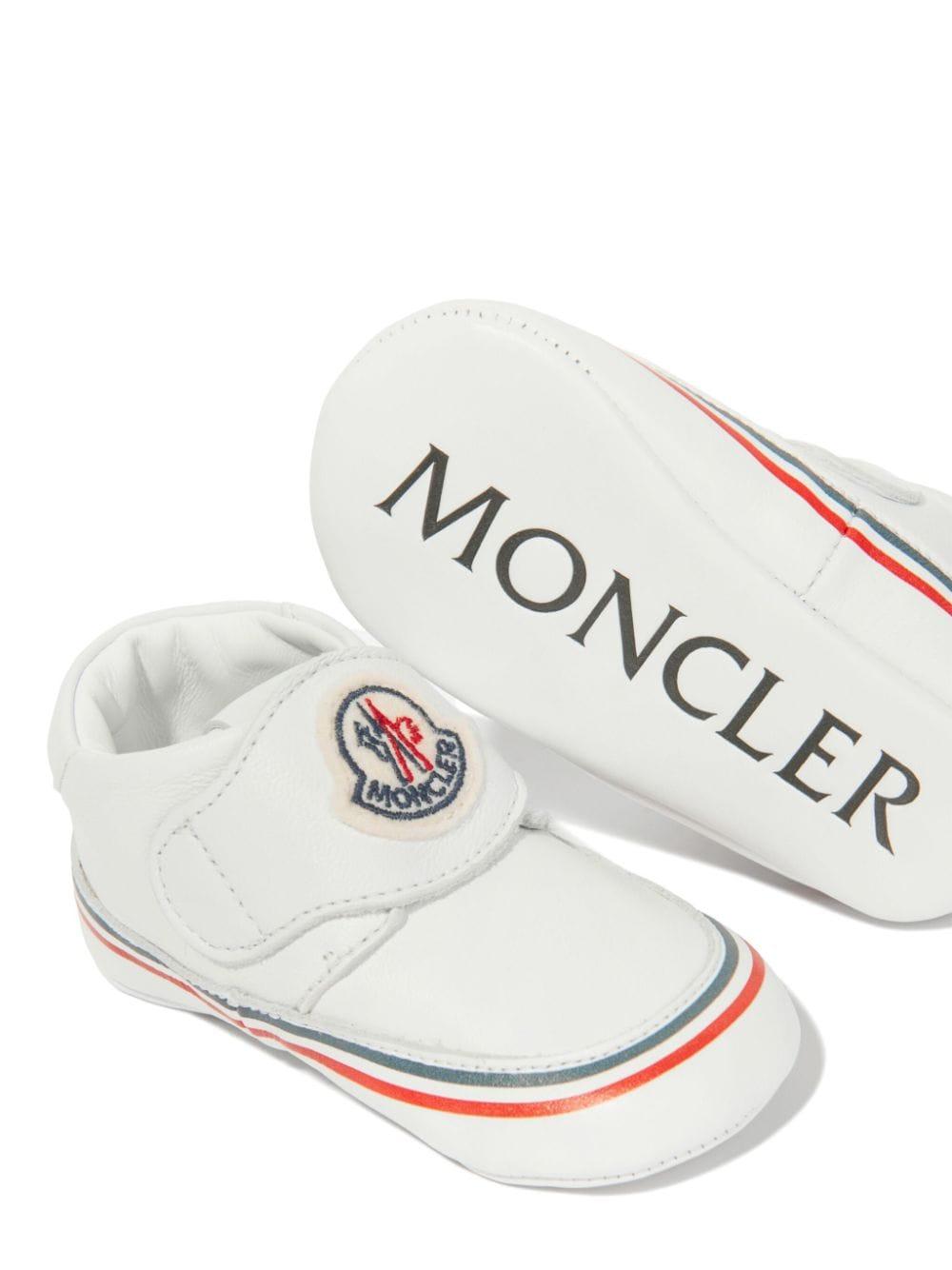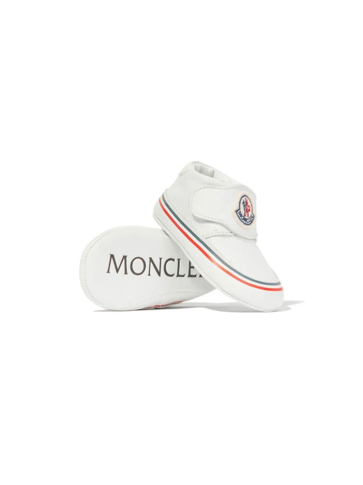 White leather sneakers for newborns with applied logo stripe from the Moncler Enfant collection.