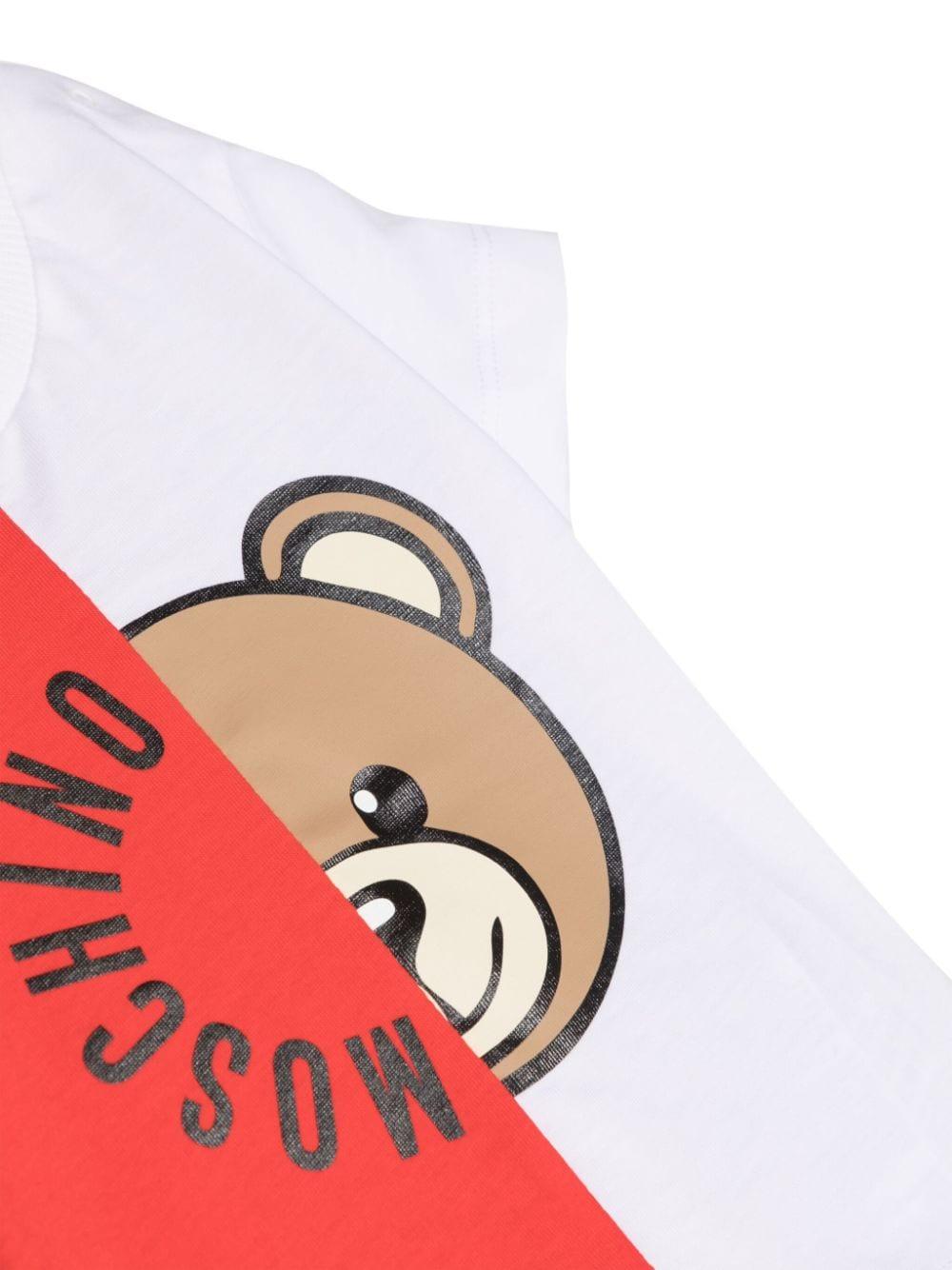 White and red cotton t-shirt for newborns with color block design from the Moschino Kids collection.