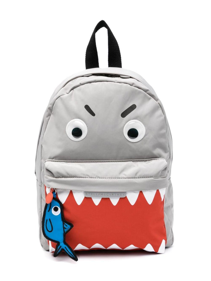 Gray taffeta backpack for children with shark print on the front from the Stella McCartney Kids collection.