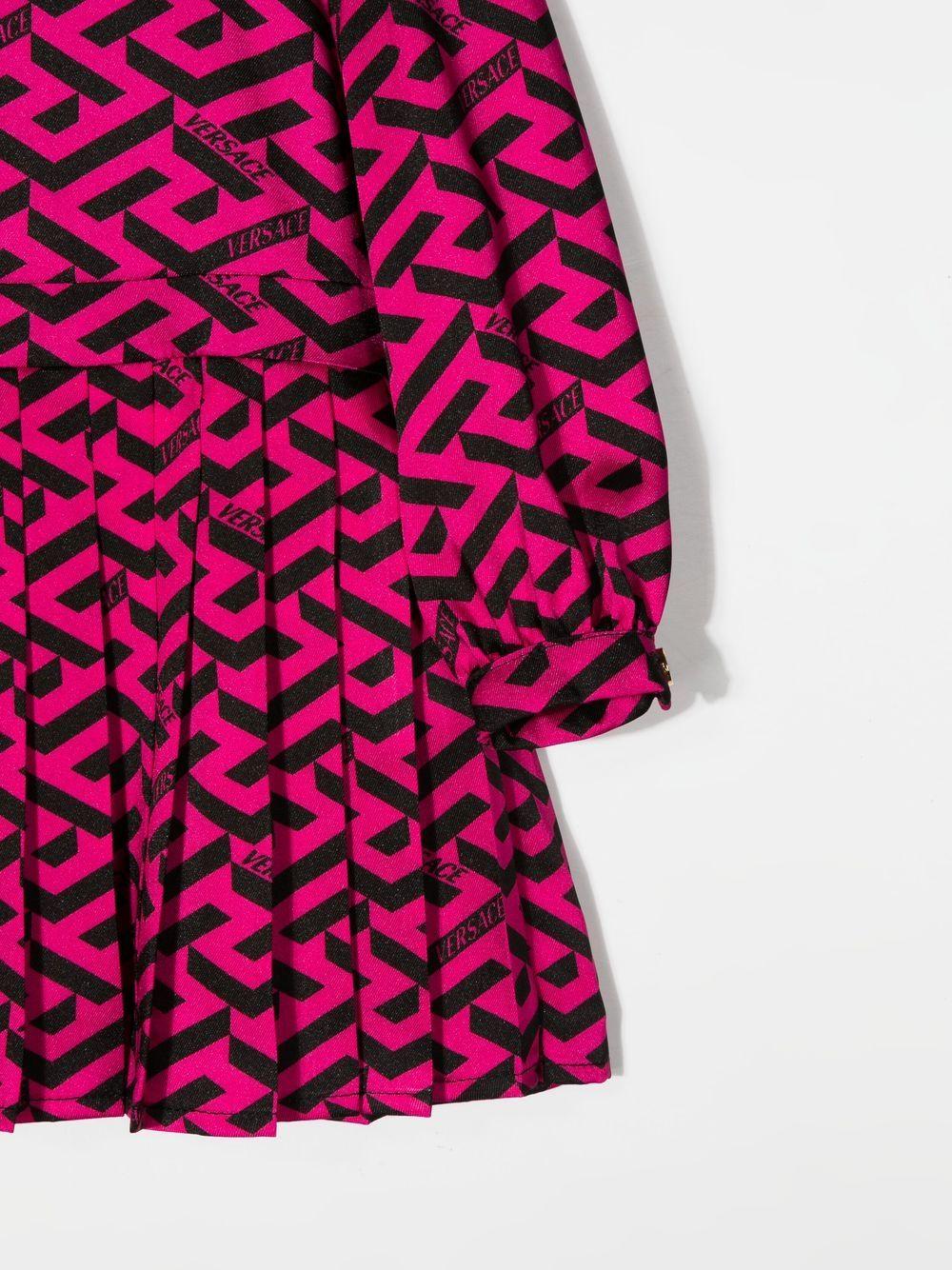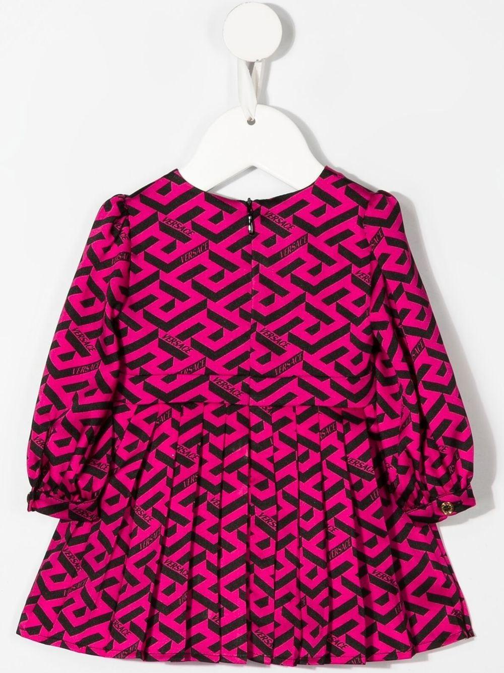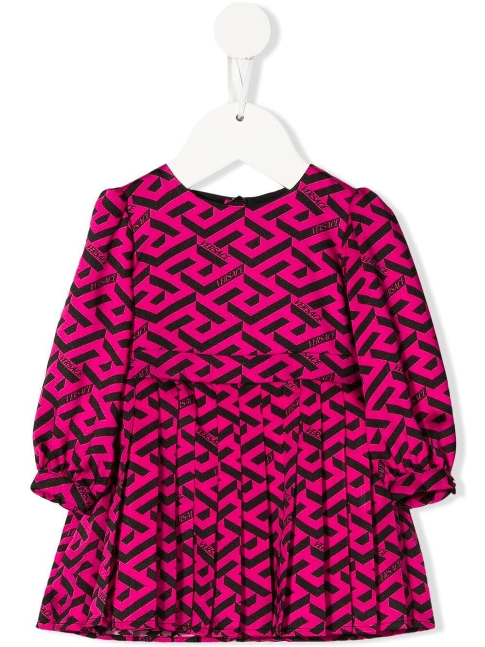 Fuchsia dress with black all-over monogram print for baby girls from Versace Kids in cotton.