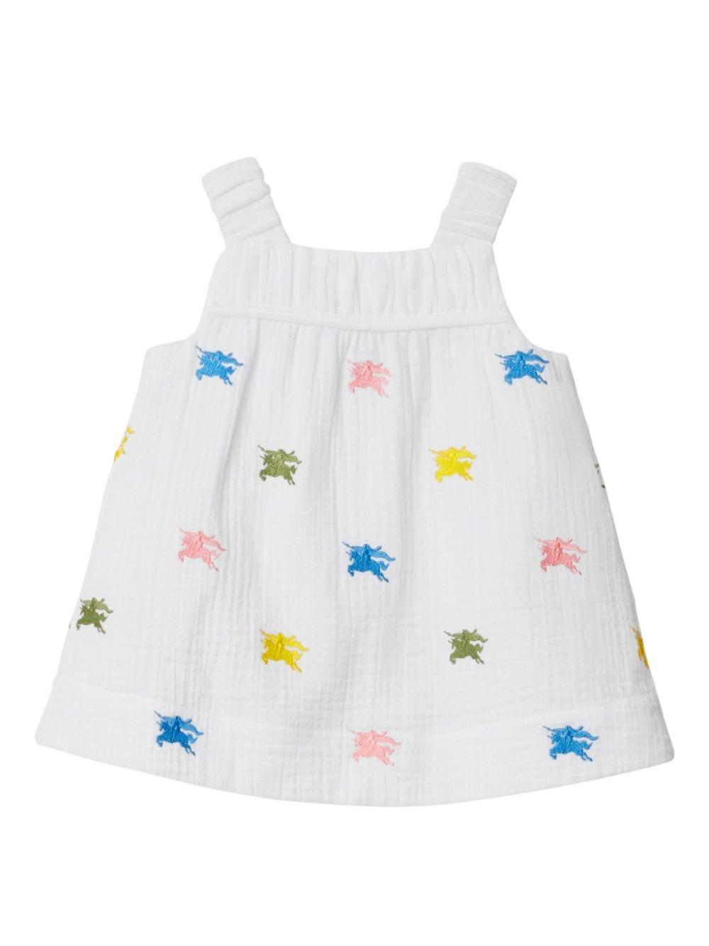 White dress and shorts for baby girls with embroidered multicolored Equestrian Knight motif by Burberry Kids.