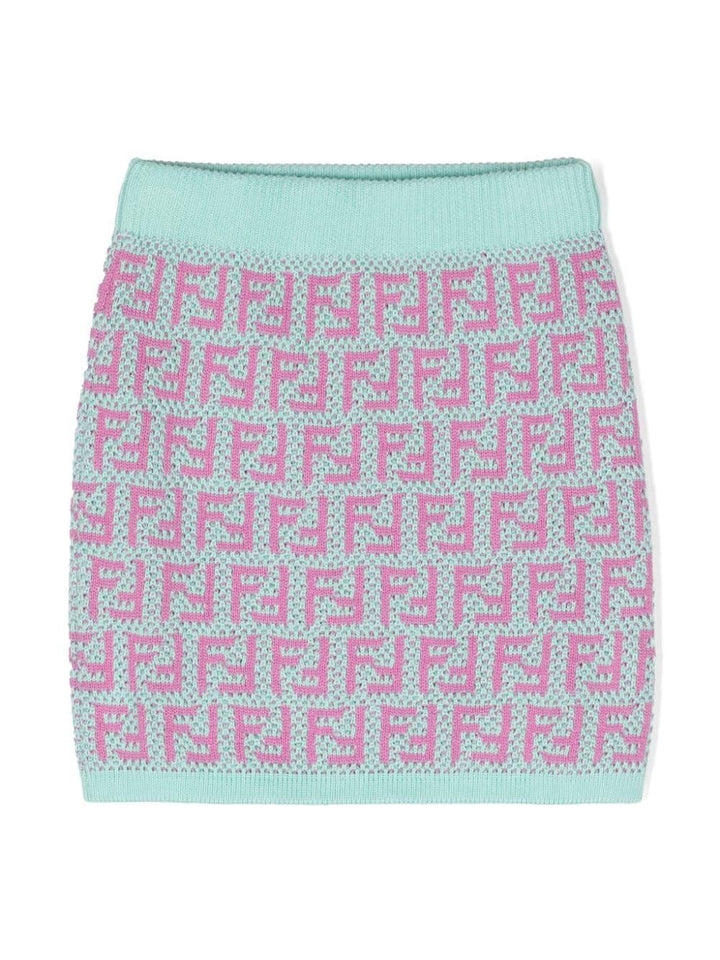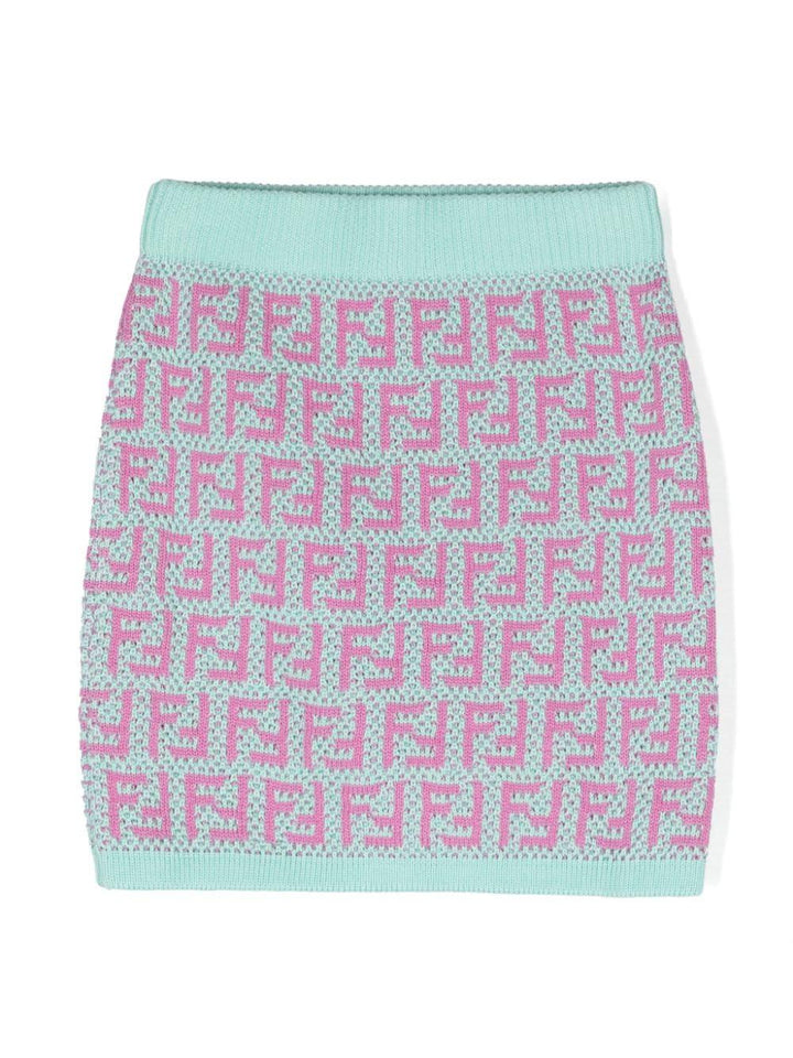 Gonna verde e rosa in misto cotone e cashmere per bambina con motivo FF di Fendi Kids.