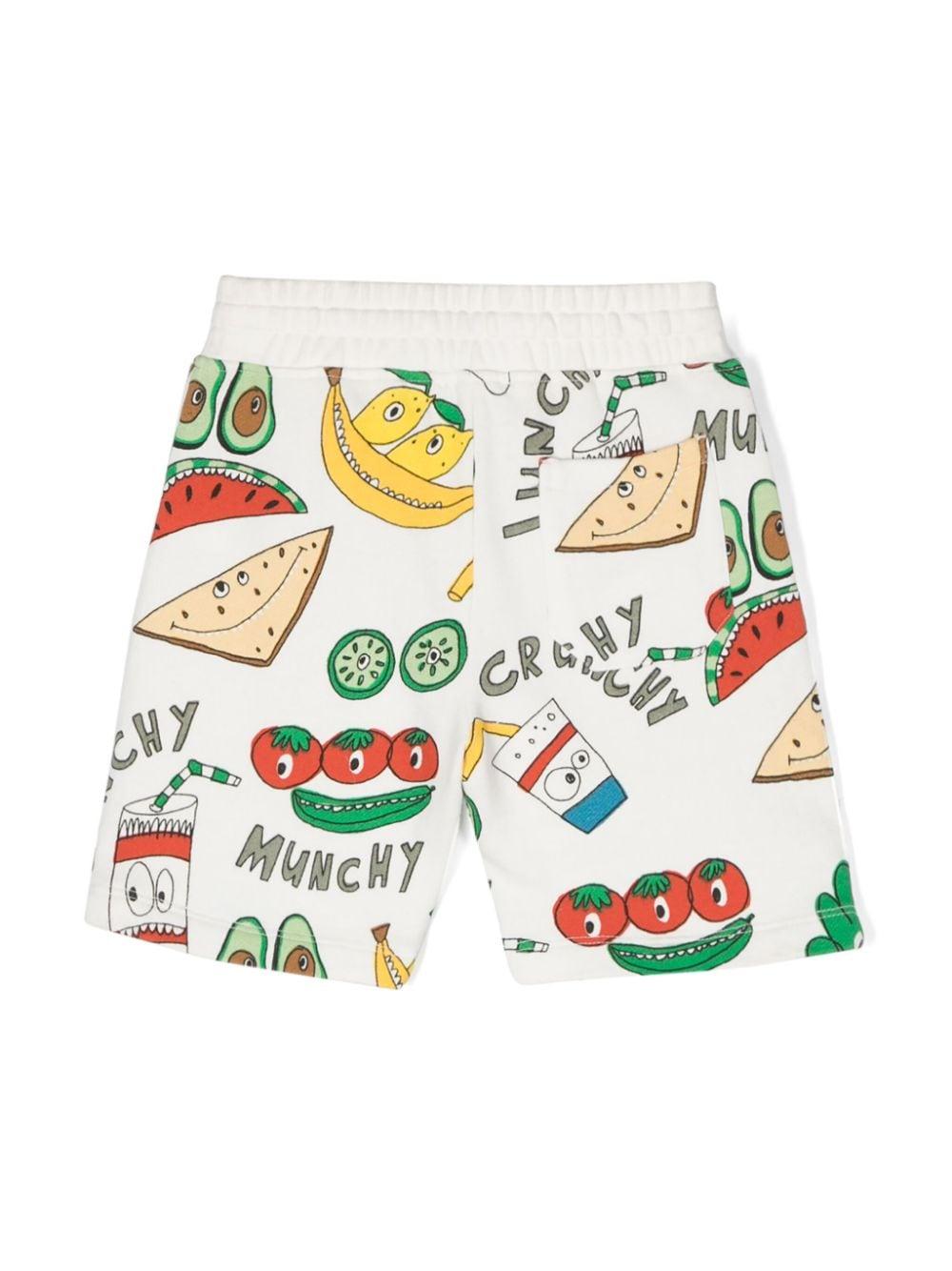 Bermuda bianca in jersey di cotone per bambino con stampa Crunchy Lunchy multicolore all-over della collezione di Stella McCartney Kids.