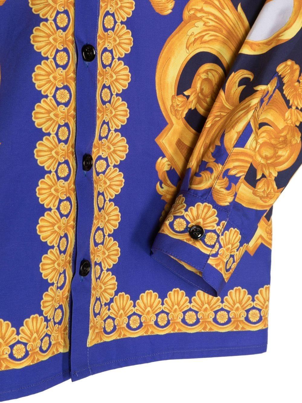 Camicia blu in cotone per bambino con stampa barocca oro di Versace Kids.