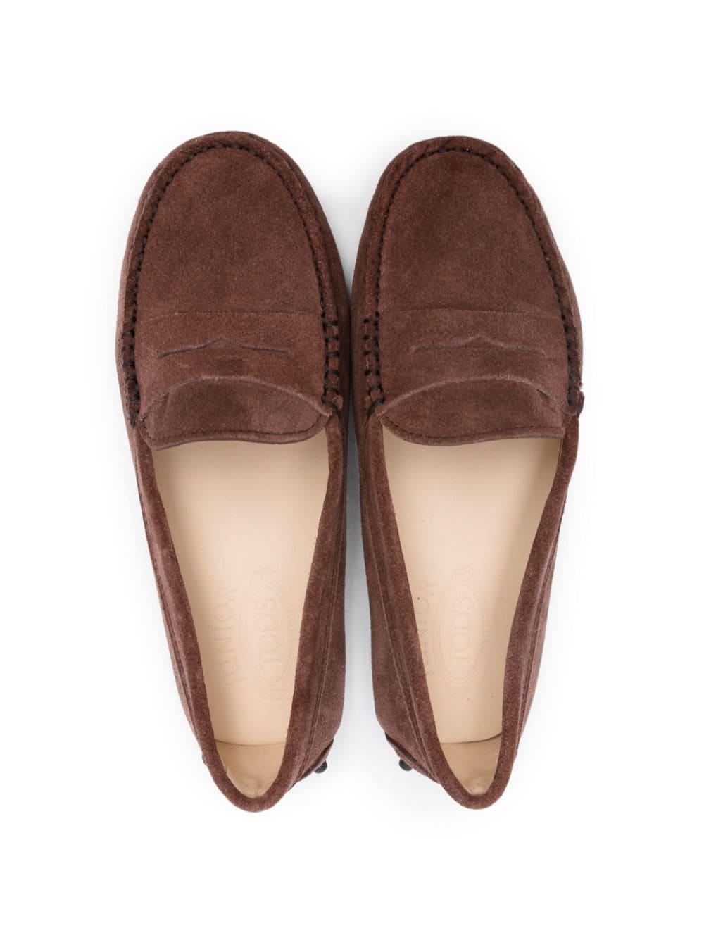 Mocassini penny marrone tabacco con logo impresso per bambino di TOD'S KIDS in pelle di vitello.