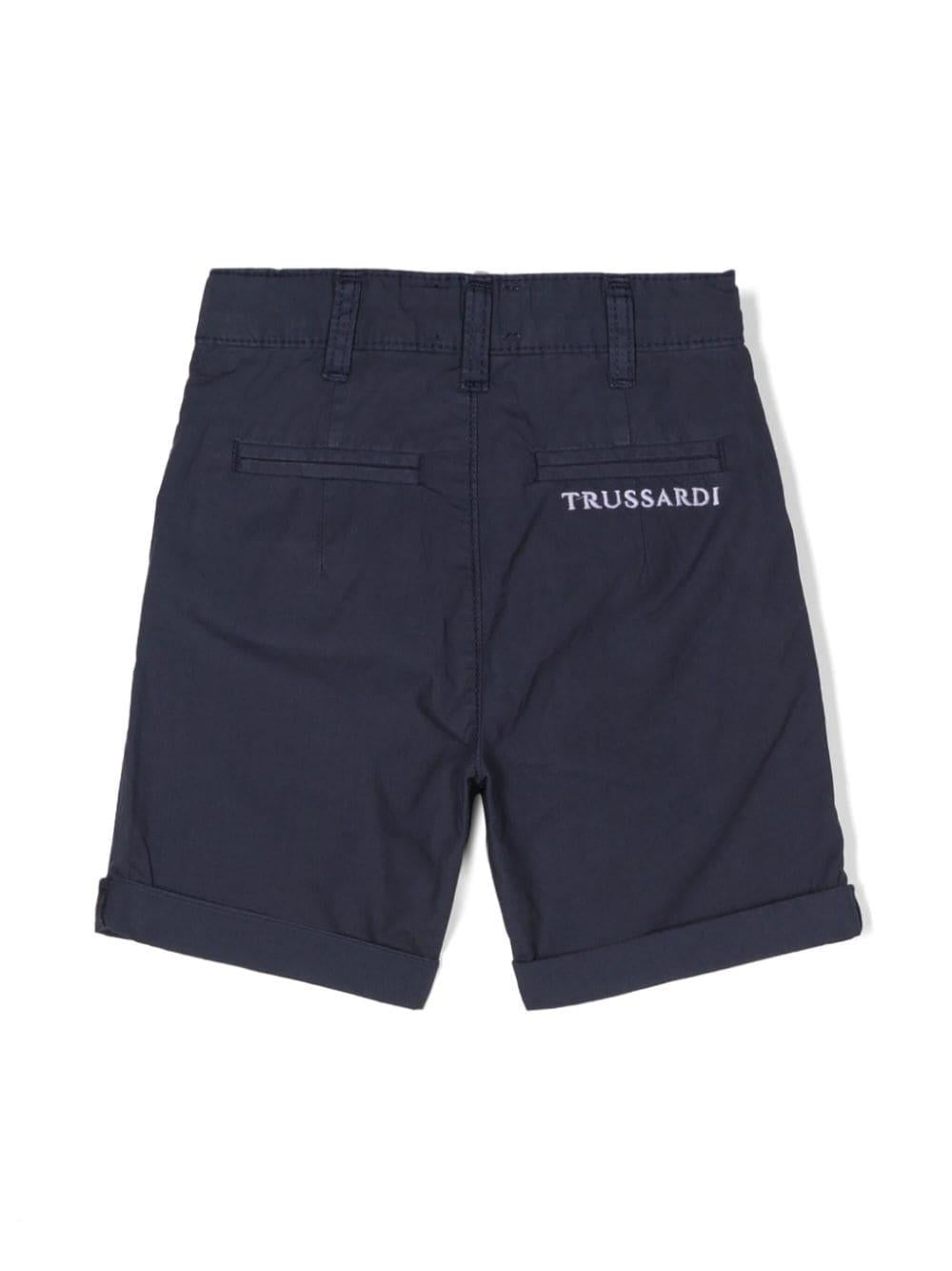 Bermuda blu navy in popeline di cotone per neonato con logo ricamato sul davanti della collezione Trussardi Kids.